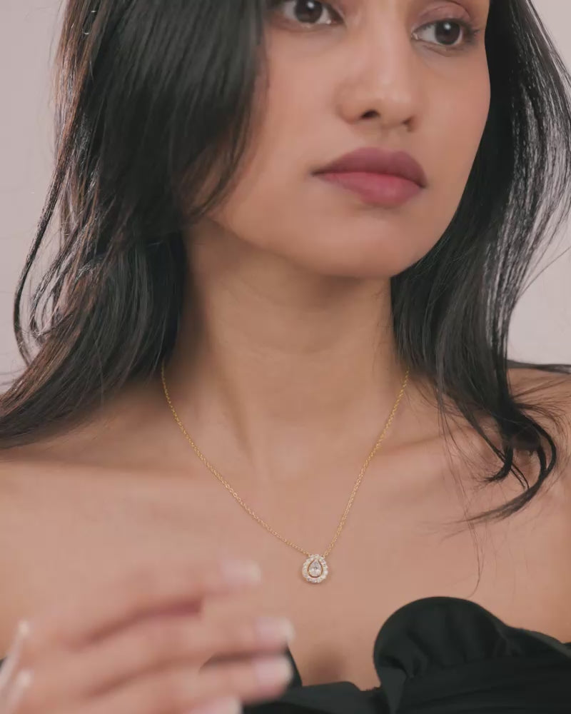 A timeless pear-shaped pendant surrounded by radiant stones, designed to add effortless elegance to your look. Perfect for both everyday wear and special occasions, this necklace layers beautifully with delicate chains or shines as a statement piece on its own.