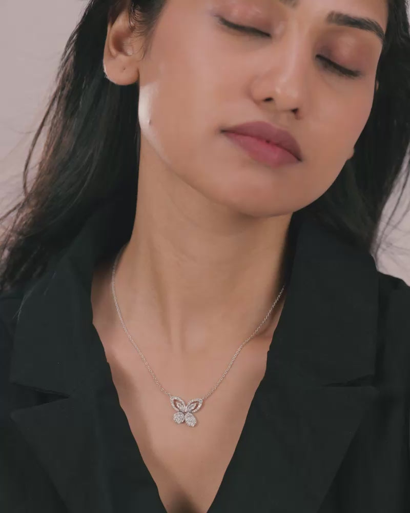 A delicate butterfly design that captures the beauty of transformation and grace. Crafted with diamond-like brilliance, this piece balances elegance with timeless charm, making it perfect as a statement necklace or for layering.