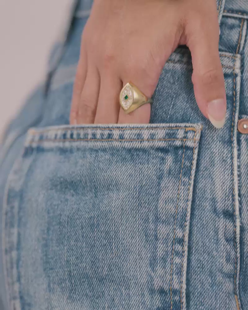 A bold marquise-shaped ring crowned with a centre emerald stone, encircled by diamond-like brilliance. With its regal charm and modern boldness, this design stands out as a true statement of elegance and power.