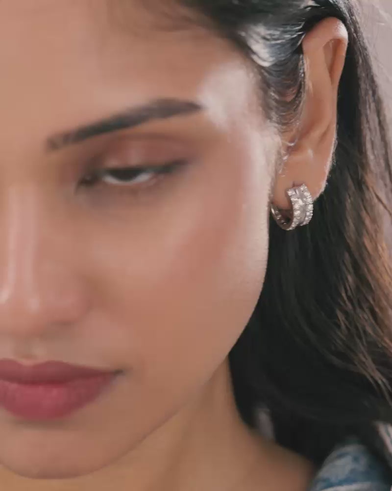 A single earring that gives the look of a perfect triple stack. Two bands fully hand set with stones frame a smooth silver band in the center — bold yet easy, and best for your weekend brunch.